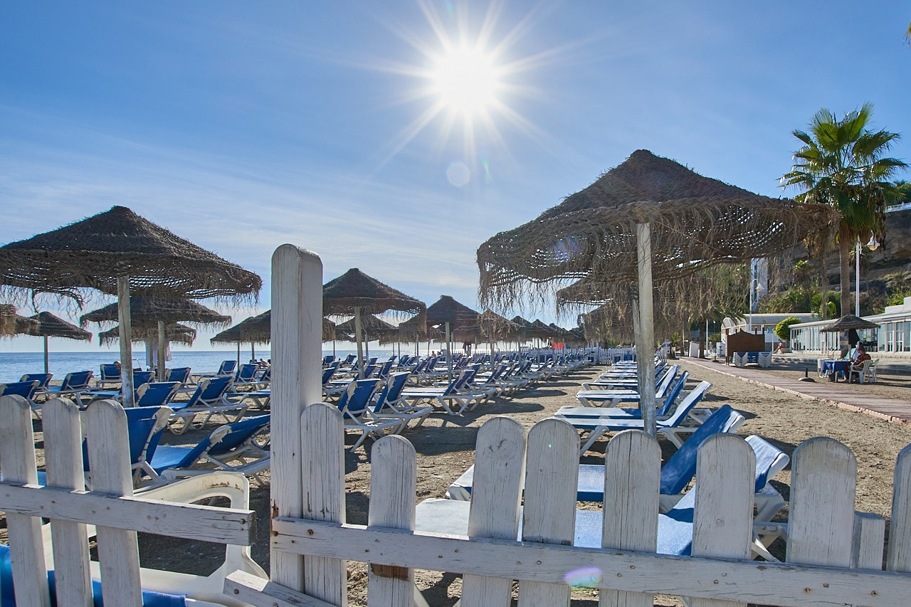 Burriana is the largest & most equipped beach in Nerja: fine golden sand, clear water, promenade, bars/restaurants, ideal for a relaxed beach-day or holiday vibe.